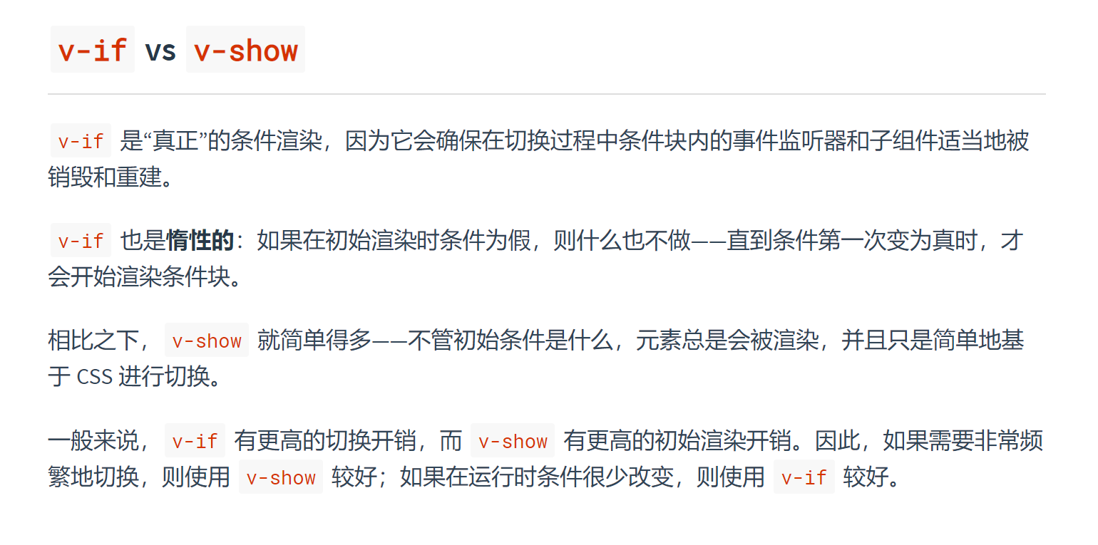 v-if 是“真正”的条件渲染,因为它会确保在切换过程中条件块内的事件监听器和子组件适当地被销毁和重建。