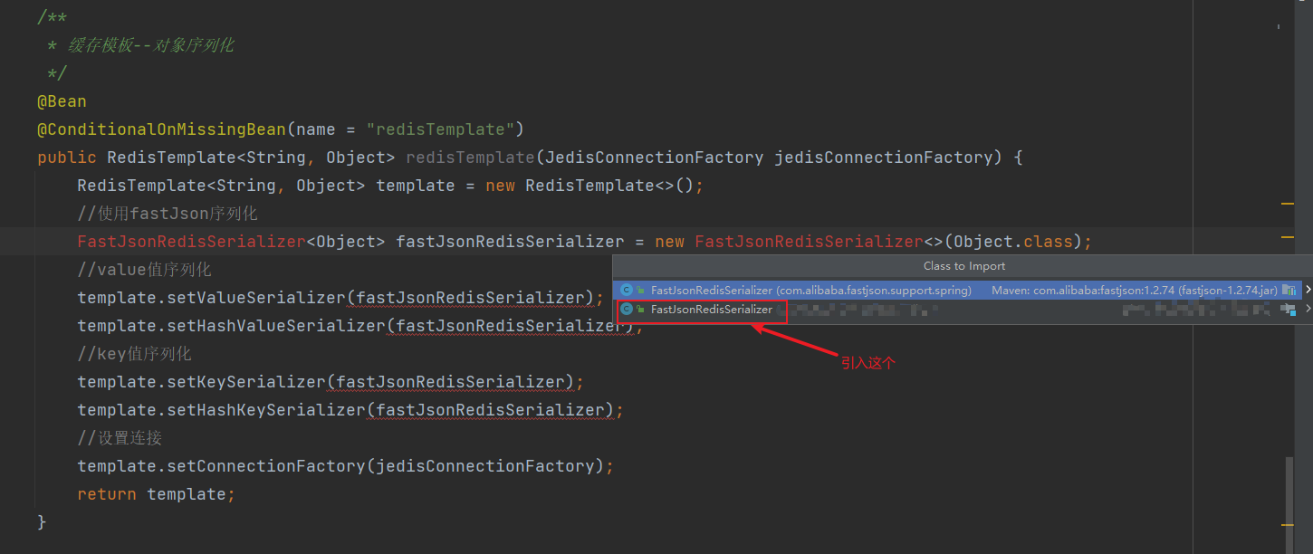 这里需要注意,在引入 `FastJsonRedisSerializer` 时,在 `com.alibaba.fastjson.support.spring` 下也有一个同名的类,不要使用 fastjson 的类,应该使用我们自己写的类进行序列化。