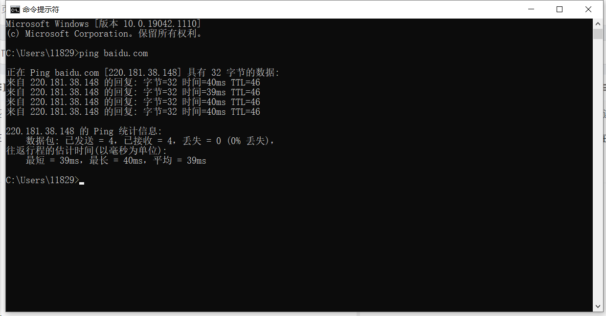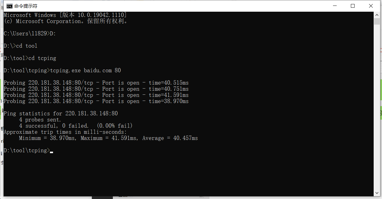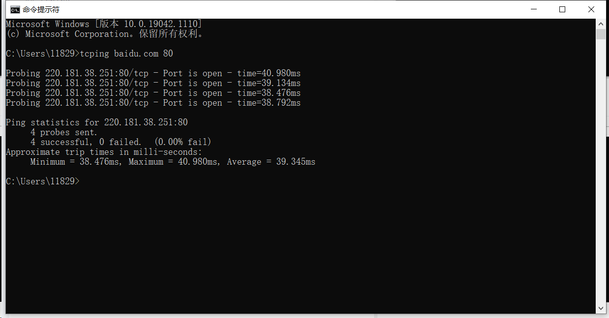 在 cmd 窗口使用tcping http://www.baidu.com命令检测网络端口状态,“Port is open”表示端口是开启状态,“time=xx.xxms”表示网络延迟值。