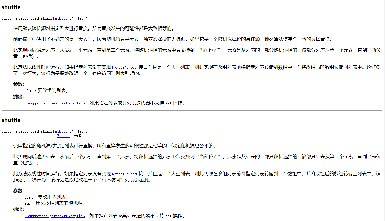 通过查看 JDK 文档可以看到这个方法的作用是**使用(默认或指定)随机源对指定列表进行置换**。