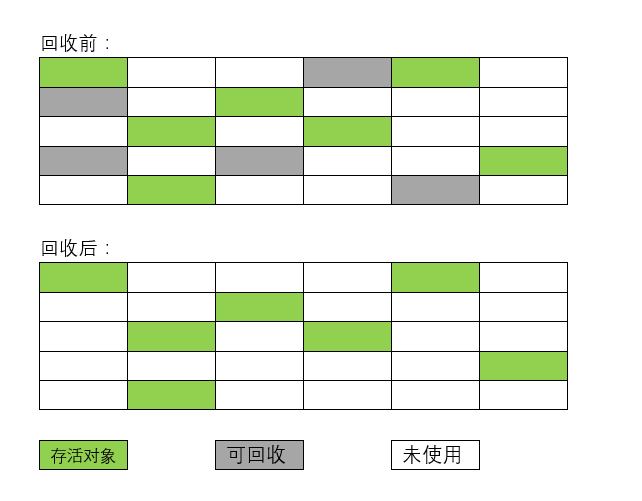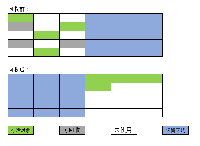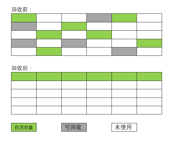 标记过程与标记-清除算法的标记过程一样,标记后不是直接进想回收清理,而是让所有对象都向一端移动,然后直接清理掉端边界以外的内存。