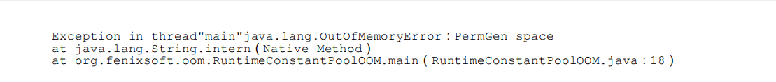 **运行时常量池溢出,在 OutOfMemoryError 后面跟随的提示信息 是“PermGen space”,说明运行时常量池属于方法区(HotSpot 虚拟机中的永久代)的一部 分。**