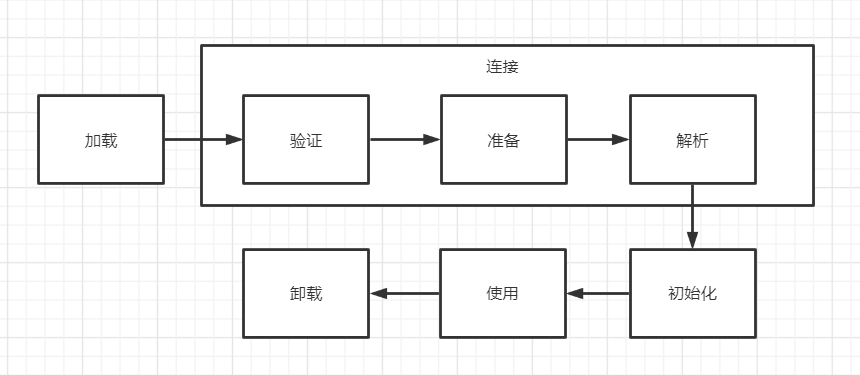 加载、验证、准备、解析、初始化、使用、卸载