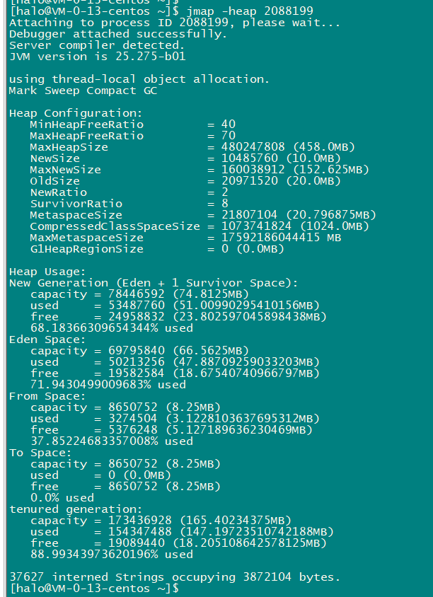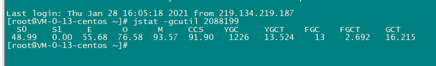 以上查询结果表明:这台服务器的新生代 Eden 区(E,表示 Eden)使用了 55.68% 的空间,两个 Survivor 区(S0、S1,表示 Survivor0、Survivor1)里面 s1是空的,s0 使用了 48.99% 的空间,老年代(O,表示Old)和永久代(P,表示Permanent)则分别使用了 76.58% 和 93.57% 的空间。程序运行以来共发生 Minor GC(YGC,表示Young GC)1226 次,总耗时 13.524 秒,发生Full GC(FGC,表示Full GC)13 次,Full GC 总耗时(FGCT,表示Full GC Time)为 2.692 秒,所有GC总耗时(GCT,表示GC Time)为 16.215 秒。