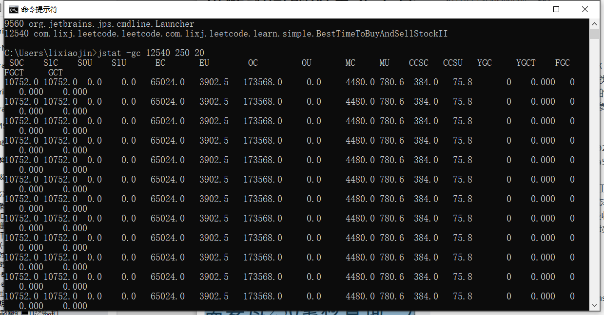 假设需要每 250 毫秒查询一次进程 12540 垃圾收集状况,一共查询 20 次,那命令应当是: