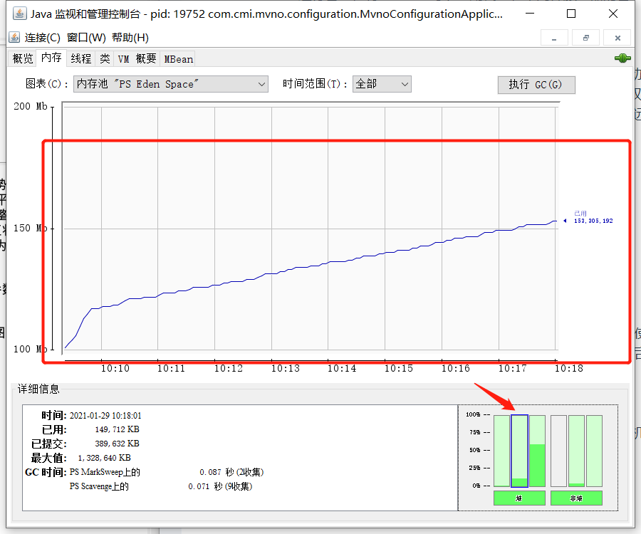 >可以看到内存池 Eden 区的运行趋势呈现折线状,而监视范围扩大至整个堆后,会发现曲线是一条向上增长的平滑曲线。