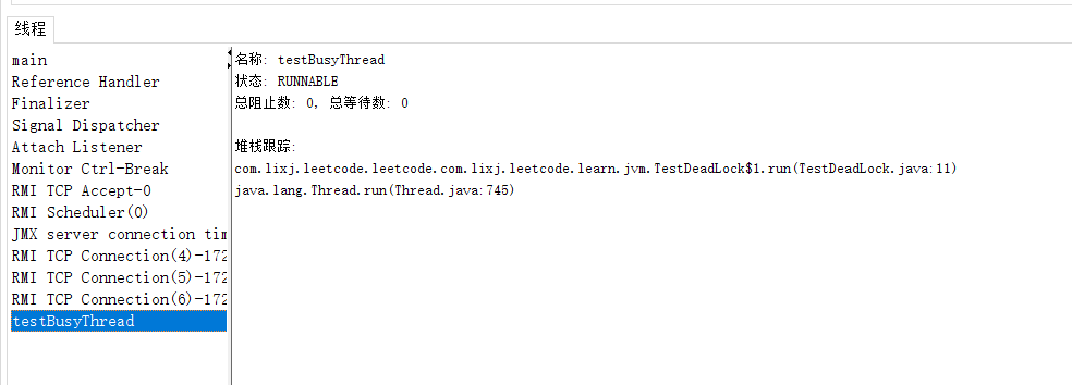 接着监控 testBusyThread 线程,如下图所示,testBusyThread 线程一直在执行空循环。这时候 线程为 Runnable 状态,而且没有归还线程执行令牌的动作,会在空循环上用尽全部执行时间 直到线程切换,这种等待会消耗较多的 CPU 资源。