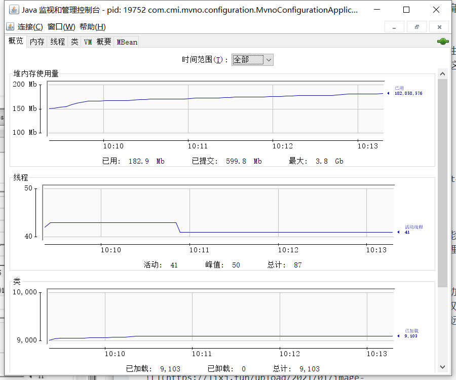 >“概述”页签显示的是整个虚拟机主要运行数据的概览,其中包括“堆内存使用情况”、“线程”、“类”、“CPU使用情况”4种信息的曲线图,这些曲线图是后面“内存”、“线程”、“类”页签的信息汇总。
