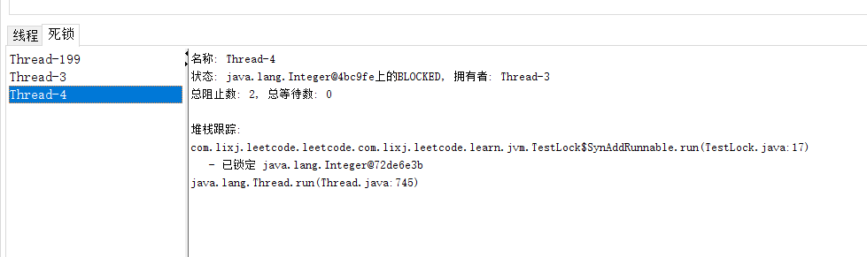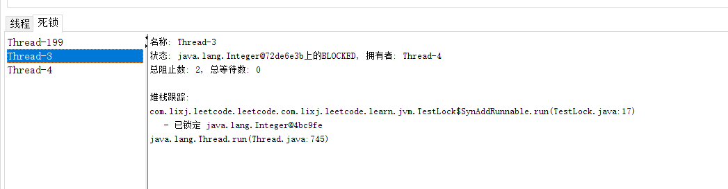 很清晰地显示了线程 Thread-3 在等待一个被线程 Thread-4 持有 Integer 对象,而点击线程 Thread-4 则显示它也在等待一个 Integer 对象,被线程Thread-3 持有,这样两个线程就互相卡住,都不存在等到锁释放的希望了。