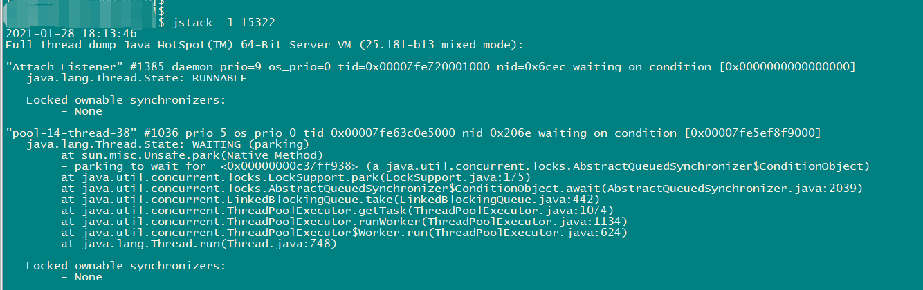 jstack(Stack Trace for Java)命令用于生成虚拟机当前时刻的线程快照(一般称为 threaddump 或者 javacore 文件)。线程快照就是当前虚拟机内每一条线程正在执行的方法堆栈的集合,生成线程快照的主要目的是定位线程出现长时间停顿的原因,如线程间死锁、死循环、请求外部资源导致的长时间等待等都是导致线程长时间停顿的常见原因。线程出现停顿的时候通过 jstack 来查看各个线程的调用堆栈,就可以知道没有响应的线程到底在后台做些什么事情,或者等待着什么资源。
