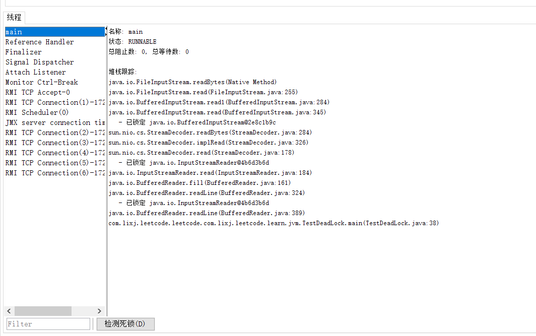 程序运行后,首先在“线程”页签中选择main线程,如下图所示。堆栈追踪显示 BufferedReader 在 readBytes 方法中等待 System.in 的键盘输入,这时线程为 Runnable 状态,Runnable 状态的线程会被分配运行时间,但 readBytes 方法检查到流没有更新时会立刻归 还执行令牌,这种等待只消耗很小的 CPU 资源。