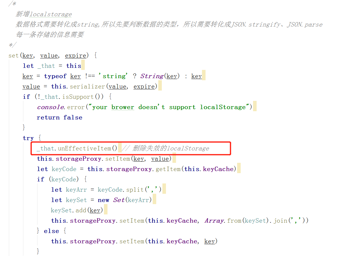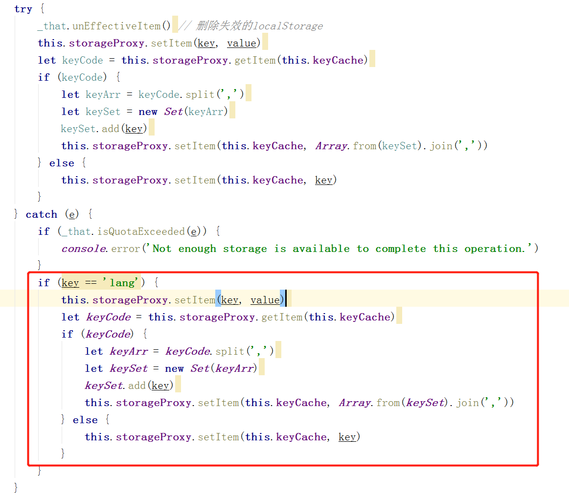 因为 localStorage.js 是公共的 js,担心大改会引发别的问题,最后决定是对 lang 字段进行特殊处理,如果删除报错,还是在 catch 里面继续进行往后的操作,插入新的 localStorage。