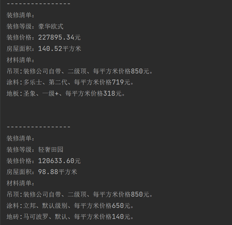 在装修包的实现中,每一种方法都返回了this对象本身,可以非常方便地用于连续填充各种物料。同时,在填充时也会根据物料计算相应面积的报价,吊顶和涂料按照面积乘以单价计算。最后,同样提供了统一的获取装修清单的明细方法。