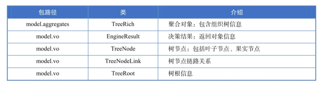 model包下的对象用于描述决策树的各项信息类,包括:聚合对象、决策结果、树节点、树节点链路关系和树根信息。