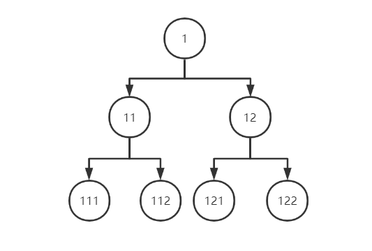 另外,在类图中插入了一个树形结构关系模拟树形结构,由树的7个节点 1、11、12、111、112、121、122 左右串联,组合出一棵二叉关系树。