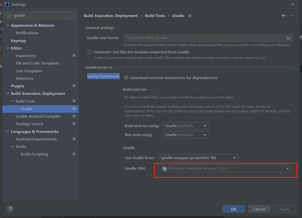 在IDEA中设置:settings -> Build,Execution,Deployment -> Build Tools -> Gradle中,设置Gradle JVM为jdk11。如下图所示: