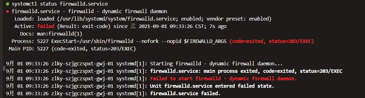 9月 01 09:33:26 zlky-01 systemd[1]: firewalld.service: main process exited, code=exited, status=203/EXEC